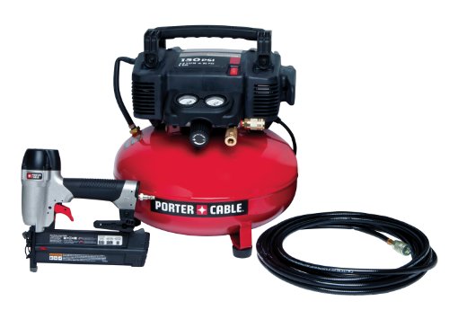 The Porter-Cable PCFP12236 Brad Combo Kit contains: a 6-gal 150 psi compressor (drives more nails than traditional 135 max psi compressor) that weighs only 30lbs, 2.6 SCFM at 90 psi, maintenance-free pump, and 120V electric unit which allows user to run on standard household current. The compressor also has a shroud, handle and console cover which protects vital components / BN200C 18 gauge 2-Inch Brad nailer which uses standard 18 ga. brad nails from 5/8-Inch to 2-Inch long, tool-free depth-of-drive adjustment with detents, tool-free jam release mechanism, and Long-life maintenance-free motor. Combo Kit also includes 25ft of 1/4-Inch air hose with a coupler and plug, and 100 brad nails of 1-1/4-Inch length. 1-year limited warranty on compressor components.