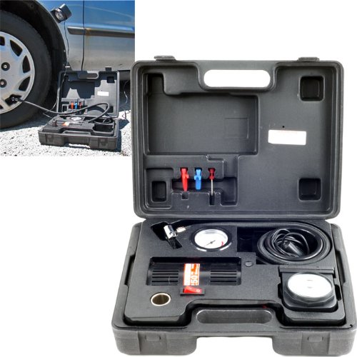 Now you can inflate all your inflatable items on the go with this fantastic Trademark Tools Portable Air Compressor Kit! The kit is lightweight and can go wherever you go. All you need is your car's cigarette lighter outlet and the compressor will take care of the rest.This 250 PSI compressor is great for camping and emergency situations. It's even good in the dark with its included light with magnetic base. Don't find yourself stranded without this incredible compressor.Features include:250 PSI (18 Bar) Compressor 12V DC 10A PowerPressure gauge measures in PSI and kg/cm2Ball inflating needle, float inflator and presta valve adapterPowerful light with magnetic base and 7.5 ft. retractable cord8.5 ft. Power cord26.5 inch Air hoseDimensions: 4.125 x 12.375 x 9.25 inchesConvenient carrying ca